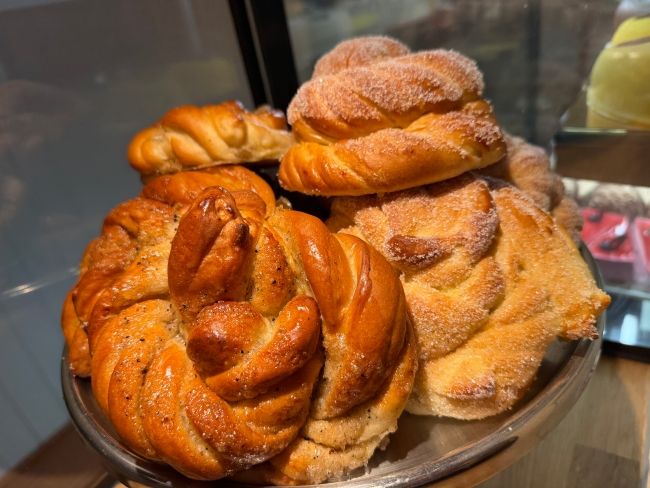 Velg mellom: kanelbolle med perlesukker eller vaniljekrem & melis.