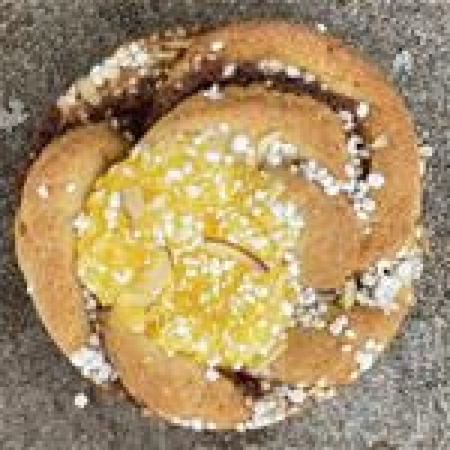 Fylt med bringebærsyltetøy og vaniljekrem.