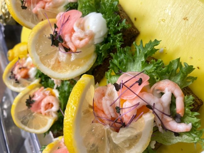Velg mellom: karbonader, eggerøre & laks, eggerøre & spekeskinke, roastbiff, reker, kylling eller svinestek.